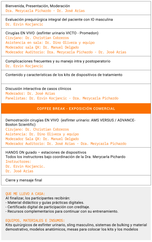 Brindar una experiencia práctica sobre la evaluación, planificación y tratamiento quirúrgico de la incontinencia urinaria masculina, incluyendo la evaluación prequirúrgica, manejo de complicaciones y aplicación de dispositivos durante la práctica con demostración en semi-vivo y Hands-on.
